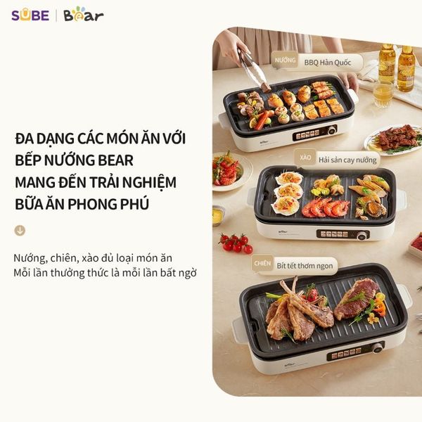 – Nướng: Bếp nướng điện Bear có khả năng điều chỉnh nhiệt độ linh hoạt, kết hợp cùng bề mặt chảo siêu rộng cho phép bạn nướng nhiều loại thực phẩm khác nhau như thịt, cá, hải sản, rau, củ,…