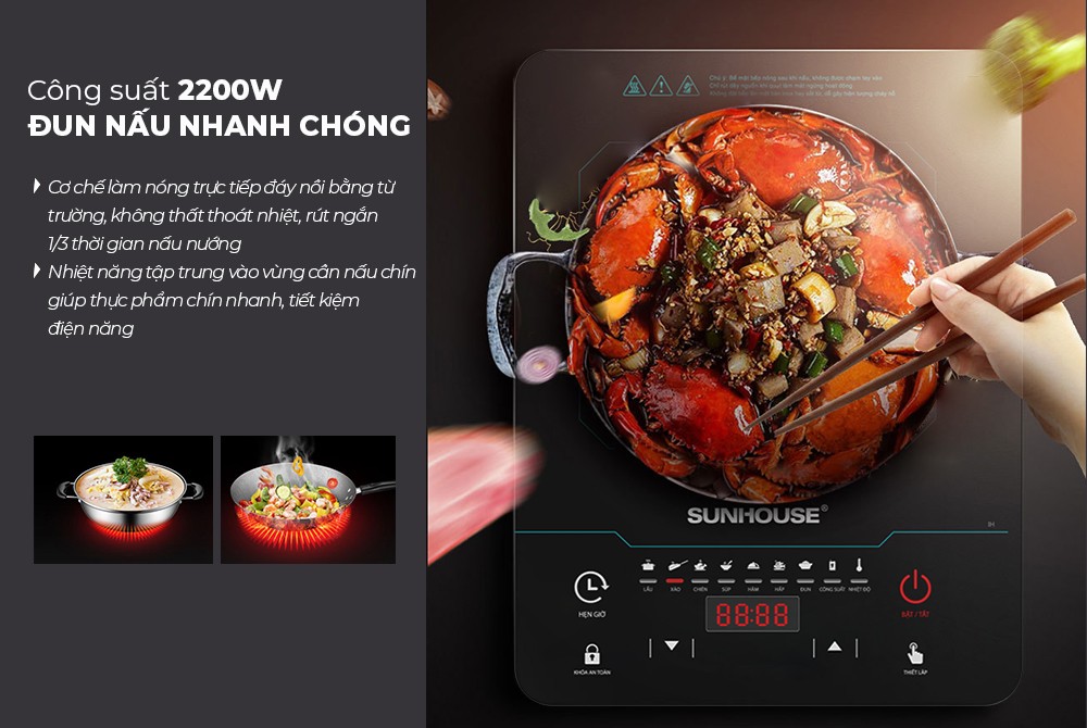 Bếp từ đơn SUNHOUSE SHD6873 có công suất cao 2200W giúp quá trình gia nhiệt diễn ra nhanh hơn. Cơ chế làm nóng trực tiếp đáy nồi bằng từ trường và nhiệt năng chỉ tập trung vào vùng cần nấu chín giúp thực phẩm chín nhanh, rút ngắn thời gian nấu nướng.