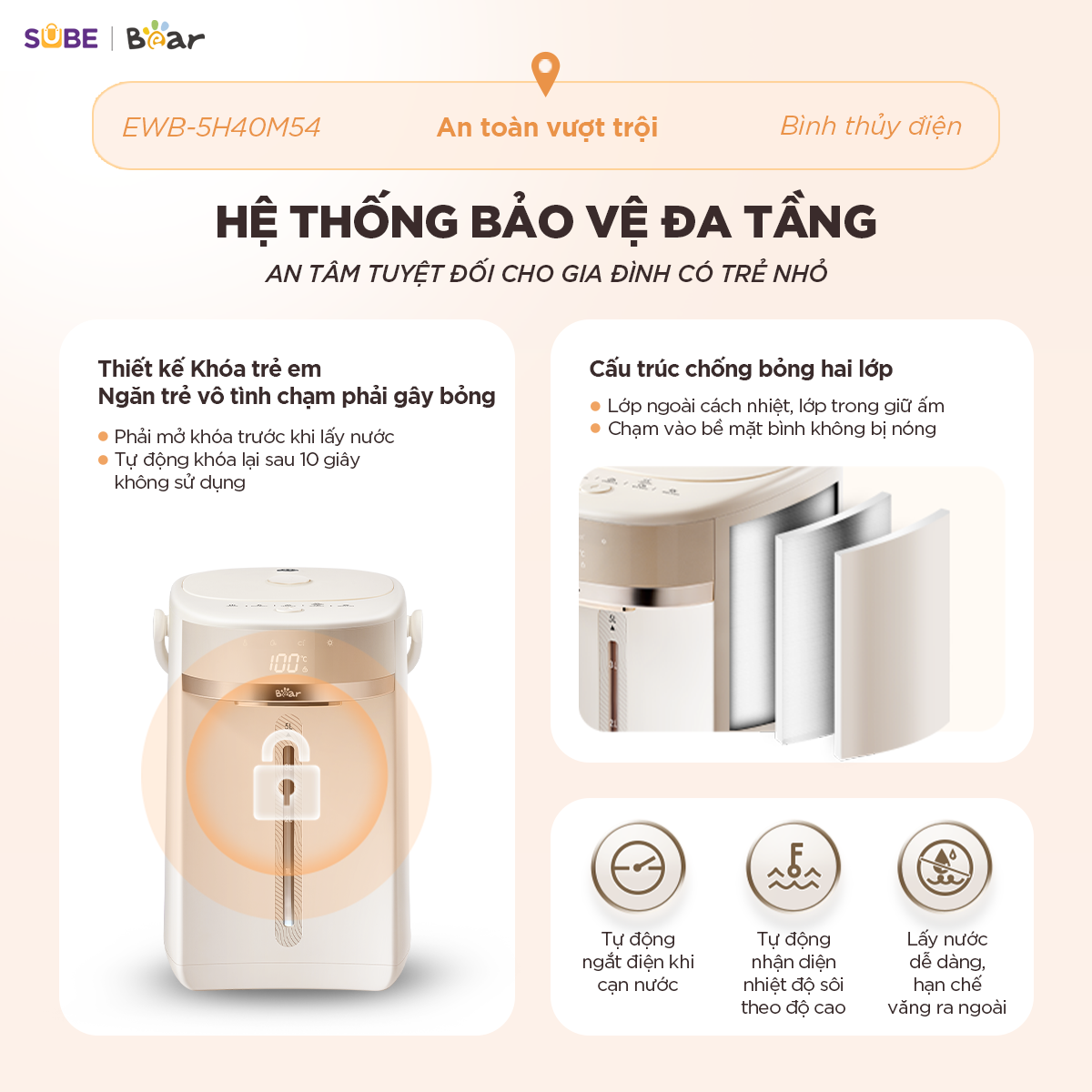 Bình thủy điện Bear 5L EWB-5H50M54 trang bị hệ thống đa lớp bảo vệ an toàn, giúp bạn yên tâm sử dụng. Cùng tìm hiểu chi tiết về các tính năng này: