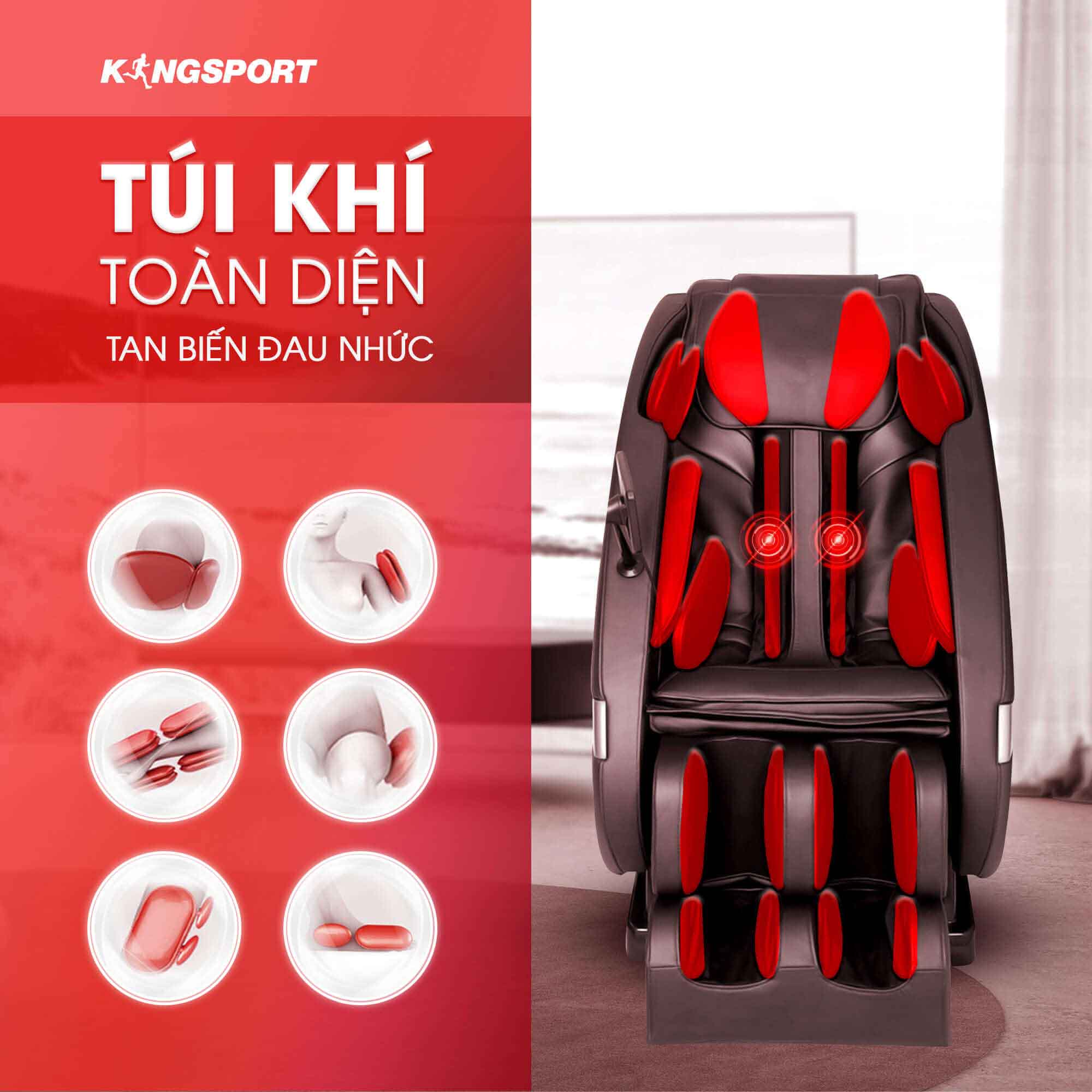 Túi khí được bố trí tại các điểm: lưng, vai, tay, hông, chân tuần tự mô phỏng các kỹ thuật bóp, nhào qua nguyên lý bơm-nhả không khí kết hợp nhịp nhàng cùng các động tác ấn huyệt, miết, nặn, nhào, xoa bóp của con lăn trên ghế massage đem lại hiệu quả massage nhẹ nhàng và thư giãn.