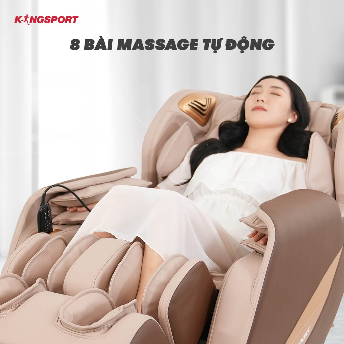 8 chương trình massage tự động được thiết kế riêng cho từng vùng cơ thể, giúp giới công sở trị những cơn đau thường gặp: massage nhanh, nhẹ nhàng, thư giãn, massage kéo giãn, massage cổ vai, massage lưng eo, toàn thân, thể thao.