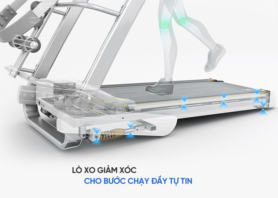 Máy được tích hợp hệ thống giảm xóc lò xo thủy lực cùng đệm cao su, nâng bước chạy của bạn nhẹ nhàng hơn, đồng thời giảm các lực phản tác động với khớp gối, cơ xương, giảm thiểu đau mỏi với thời gian luyện tập lâu.