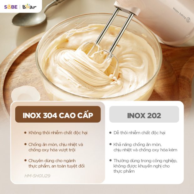 Bản que rộng: Thiết kế này không chỉ để làm đẹp. Tăng bề mặt tiếp xúc với nguyên liệu, lùa được nhiều không khí vào hỗn hợp hơn trong mỗi vòng quay, giúp quá trình đánh bông diễn ra nhanh hơn.
