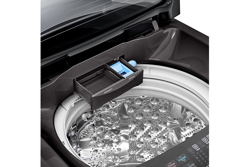 Trên máy giặt lồng đứng này, LG trang bị thêm công nghệ Turbo Drum tạo dòng nước xoáy nhờ mâm giặt và lồng giặt hoạt động ngược chiều giúp quần áo được giặt sạch hơn trông thấy.