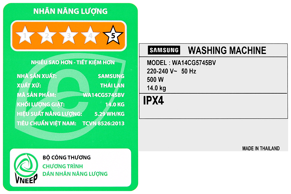 - Sản phẩm đạt 5 sao về nhãn năng lượng với hiệu suất sử dụng điện khoảng 5.29 Wh/kg.