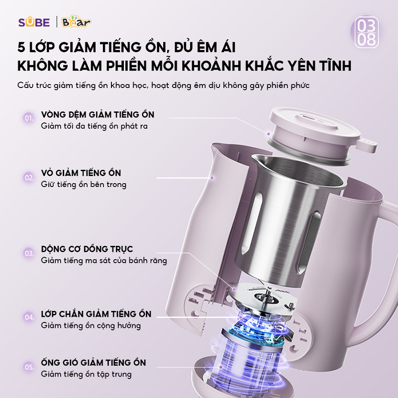 Chiếc máy làm sữa hạt Bear 0.6L SB-SH06D được thiết kế với công nghệ tiên tiến, bao gồm 5 lớp giảm tiếng ồn được cấu trúc một cách khoa học. Với lớp vòng đệm ở nắp cốc giúp giảm hiệu quả tiếng ồn phát ra trong quá trình hoạt động. Lớp vỏ bên ngoài được thiết kế đặc biệt để giữ tiếng ồn bên trong máy. Động cơ đồng trục được tích hợp để giảm tiếng ma sát giữa các bánh răng, tạo ra một quá trình hoạt động êm ái và hiệu quả. Cùng với lớp chắn và ống gió bên trong giúp giảm tiếng ồn cộng hưởng và tiếng ồn tập trung, mang lại trải nghiệm sử dụng mượt mà và nhẹ nhàng hơn.