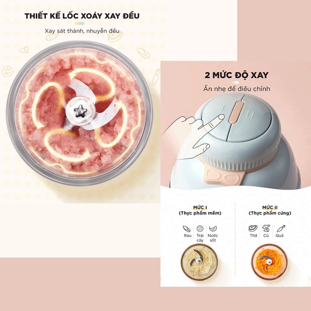 Máy xay ăn dặm Bear 0,6L GR-B06V1 có 2 chế độ xay, cho phép các mẹ xay nhuyễn nhiều loại thực phẩm khác nhau, từ mềm đến cứng, đáp ứng đa dạng khẩu phần ăn, cung cấp đầy đủ dinh dưỡng cho bé phát triển.