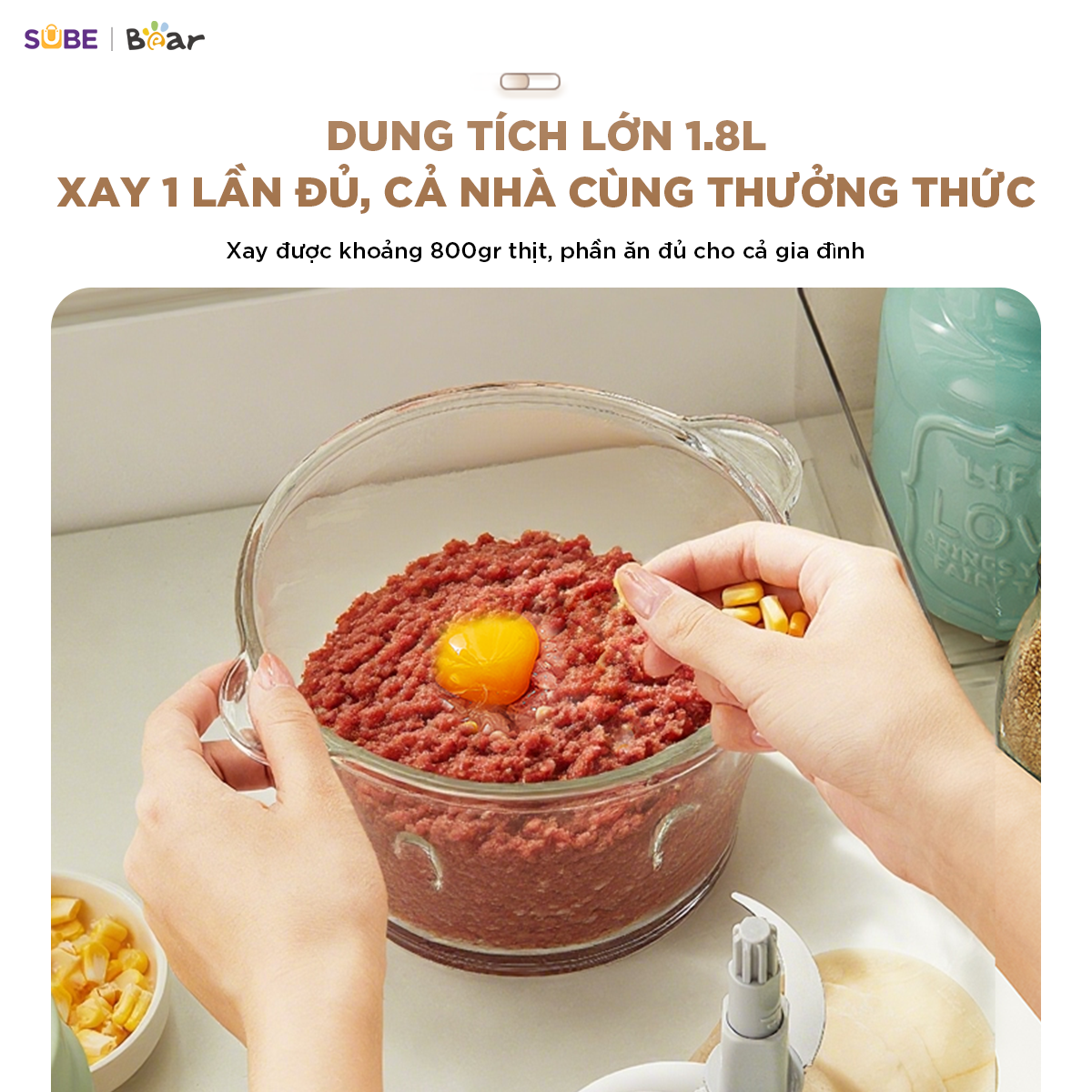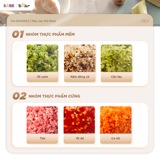 Máy xay thịt Bear 1.8L CH-5H03E33 sẽ khơi nguồn cảm hứng sáng tạo vô tận trong gian bếp. Bạn có thể dễ dàng chế biến hàng loạt món ngon và bổ dưỡng cho gia đình như thịt viên, chả cá, nem rán, pate gan, ruốc bông, hay các loại sốt đậm đà, giúp bạn trổ tài nấu nướng và đáp ứng nhu cầu của mọi thành viên trong gia đình.