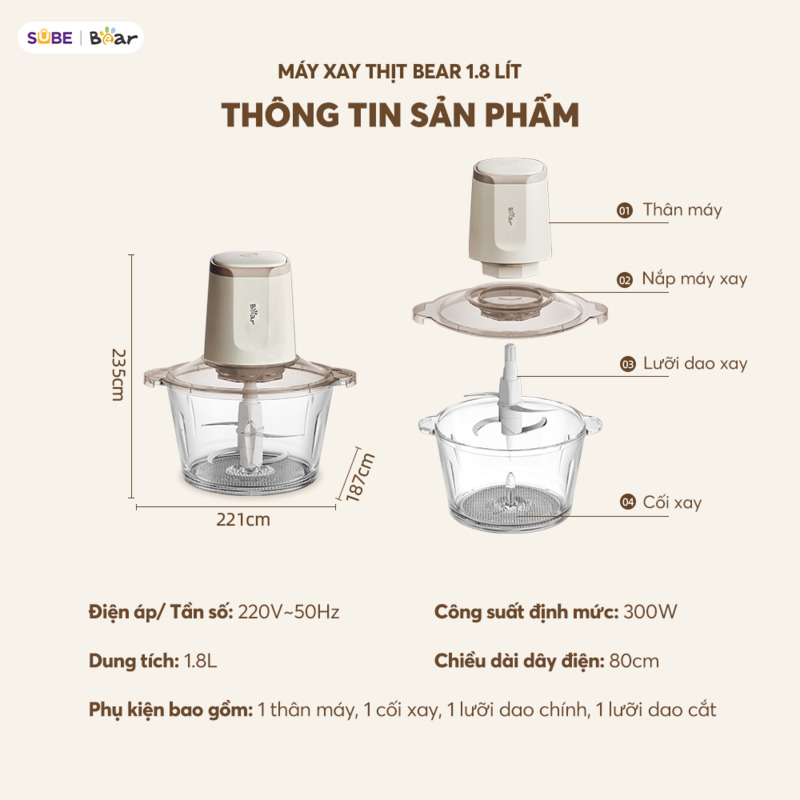 Khối lượng xay khuyến nghị: Máy có thể xay tối đa khoảng 800g thịt (đã cắt nhỏ) hoặc 300g các loại rau củ, gia vị trong mỗi lần, đáp ứng tốt nhu cầu nấu nướng hàng ngày.