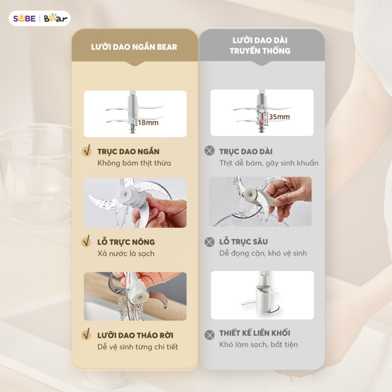 Thiết kế trục dao tối ưu: Trục lưỡi dao ngắn và lỗ trên trục nông giúp giảm thiểu các khe hở nơi thịt vụn có thể mắc kẹt, rửa sạch nhanh chóng dưới vòi nước, loại bỏ hoàn toàn cặn bẩn.
