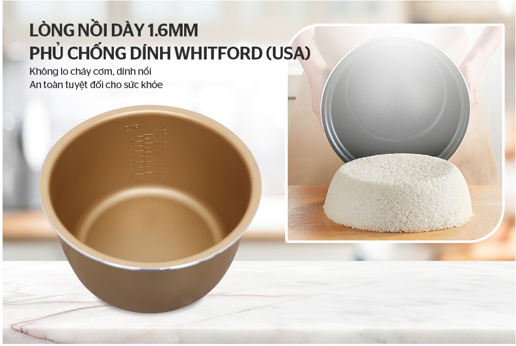 Lòng nồi được làm từ hợp kim nhôm dày 1.6mm, phủ chống dính Whitford (USA) bền đẹp, chịu được nhiệt độ cao, không phát sinh các khí độc hại trong quá trình sử dụng, không chứa các độc tố gây hại cho sức khỏe.