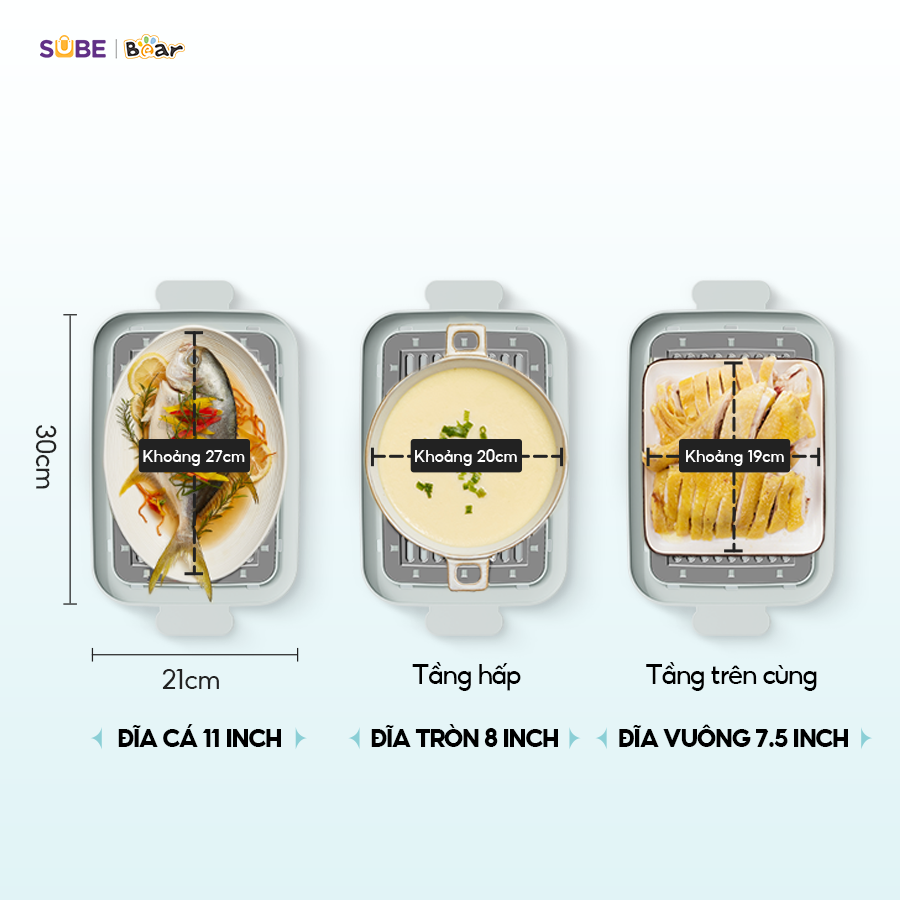 Khoang hấp dài và rộng, thiết kế tháo rời để có thể hấp các thực phẩm với kích thước phù hợp. Có thể hấp gà 3kg, hấp cả con cá không cần cắt ngắn giúp món ăn ngon và đẹp mắt hơn. Các khay hấp bằng inox hình chữ nhật giúp để vừa nhiều loại đĩa hơn.