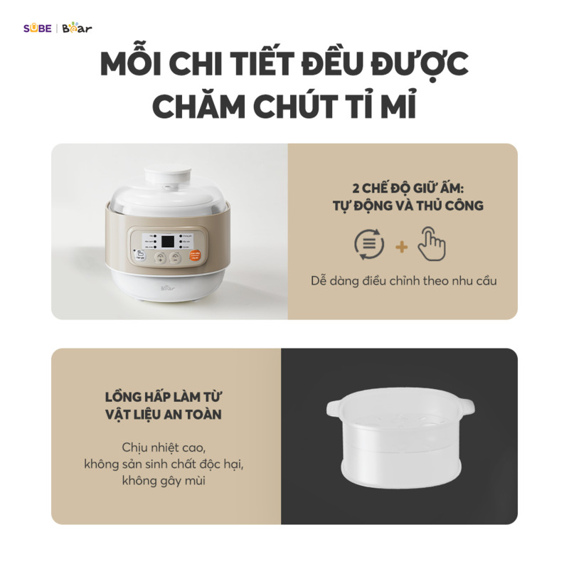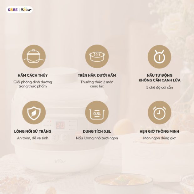 - Đơn giản hóa việc nấu nướng: Tích hợp 5 chương trình tự động được nghiên cứu dành riêng cho nhu cầu dinh dưỡng của mẹ và bé gồm Hấp, Hầm canh, Nấu cháo, Chưng yến, Nấu chè.