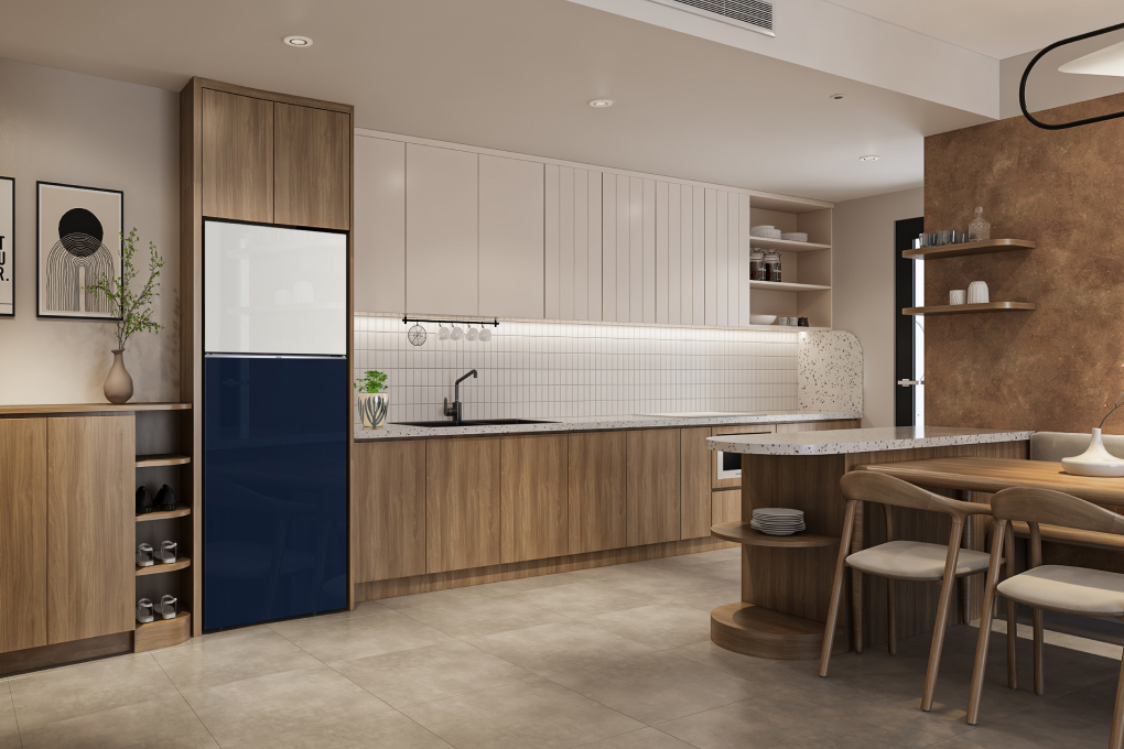 - Chất liệu mặt cửa kính cao cấp, tăng thêm sự sang trong cho gian bếp, duy trì tính thẩm mỹ cao, sử dụng bền lâu, thiết kế phẳng với tay cầm ẩn tinh tế.